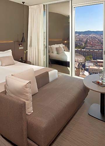 The room offers panoramic views of Barcelona and features a Nespresso coffee maker, a mini-bar and a flat-screen TV. The private bathroom has a rain-effect shower and includes The Level bathrobe and slippers.